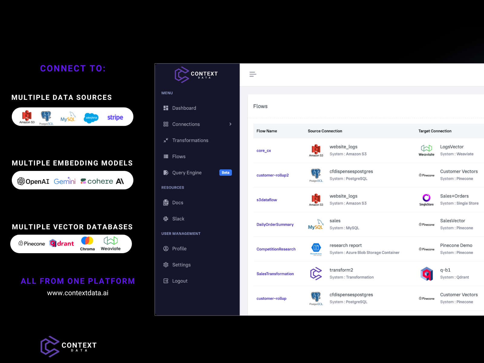 Context Data is an enterprise data infrastructure built to accelerate the development of data pipelines for Generative AI applications. The platform automates the process of setting up internal data processing and transformation flows using an easy-to-use connectivity framework where developers and enterprises can quickly connect to all of their internal data sources, embedding models and vector database targets without having to set up expensive infrastructure or engineers. The platform also allows developers to schedule recurring data flows for refreshed and up-to-date data. For developers and companies building Generative AI applications, one of their biggest challenges is building and maintaining scalable data infrastructure for creating contextual data which will power their AI applications. Think about the efficient movement of data from their various sources (MySQL, Salesforce, Amazon S3) as well as transformations (joins, aggregations etc.) to the final vector databases. Context Data allows them to quickly achieve this without having to write any code. Imagine creating a scheduled process that extracts financial and legal information from your pdf documents and writes it to your Pinecone vector database within 10 minutes. Context Data is able to create this end-to-end process in as little as 10 minutes without having to create expensive infrastructure and writing hours of complicated code.